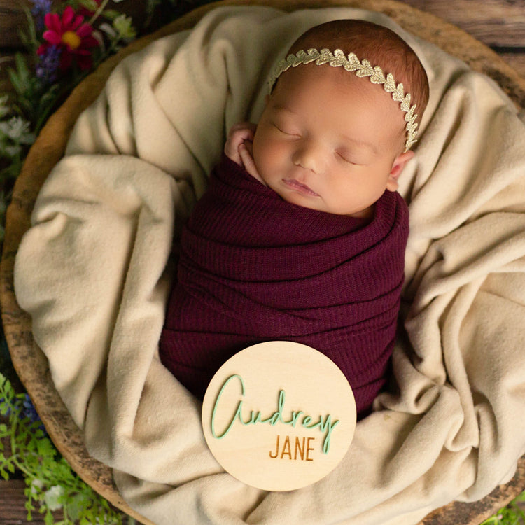 The Audrey Jane font duo is a combination of a bold brush script font and a strong serif font, which creates a dynamic and eye-catching contrast. This font duo is versatile and can be found in a variety of products we offer, such as name signs where the script font is used first like the Audrey Jane name signs or in the Wyatt Andres products where the serif font is used first.