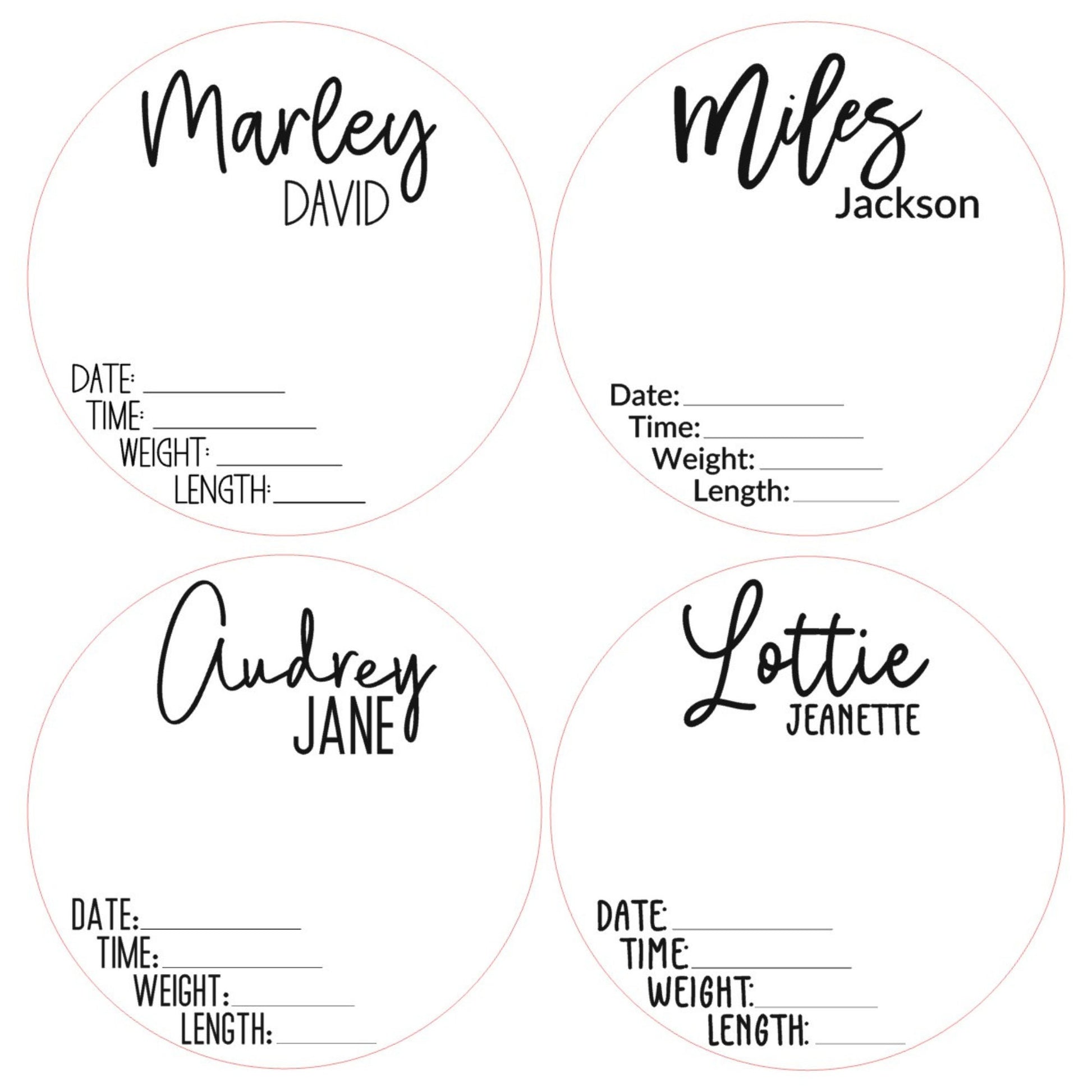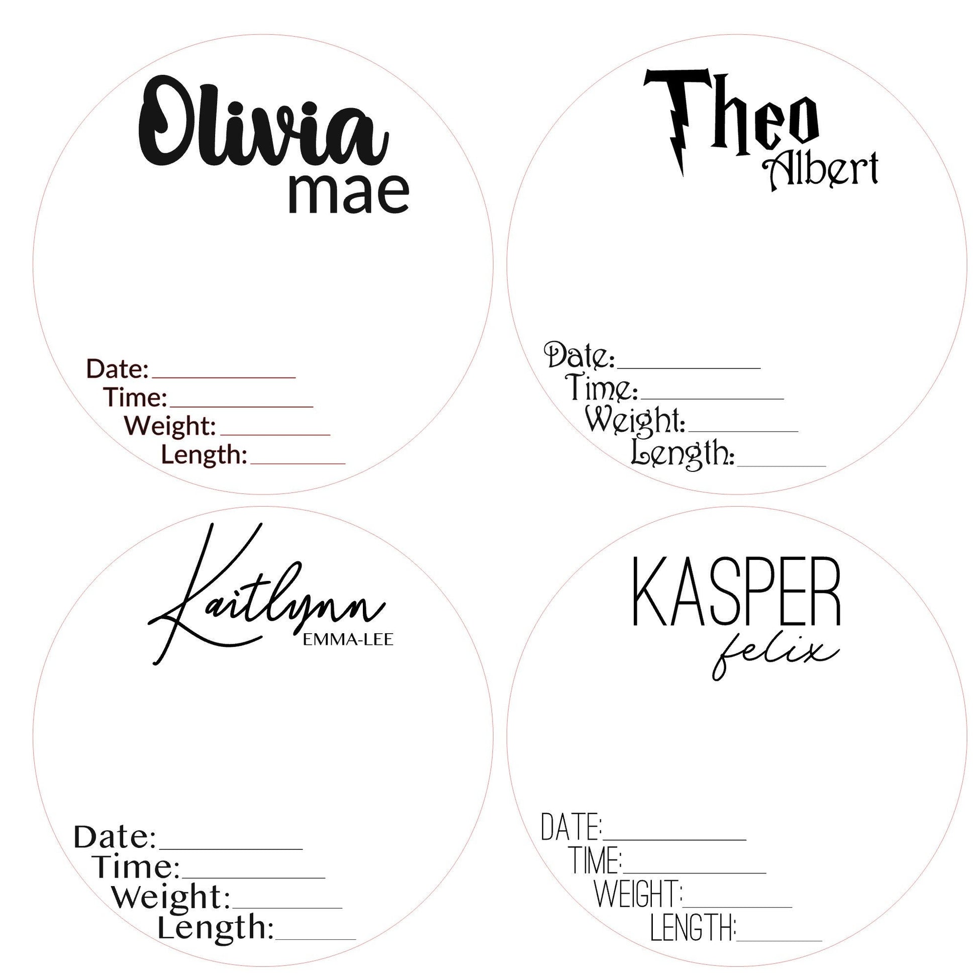 Ordering is easy, simply select the style you would like from the first drop down menu, a 6.25” Footprint sign, or an 8” Footprint sign with space for birth stats, and if you would like the mess free ink pad included with the sign. Next select which font style you would like engraved, see photos for examples (fonts coordinate with the majority of our name and milestone cards, available on our shop homepage. Please note “Kasper Felix” is the same font option as “Hudson Hayes” shown in other listings).