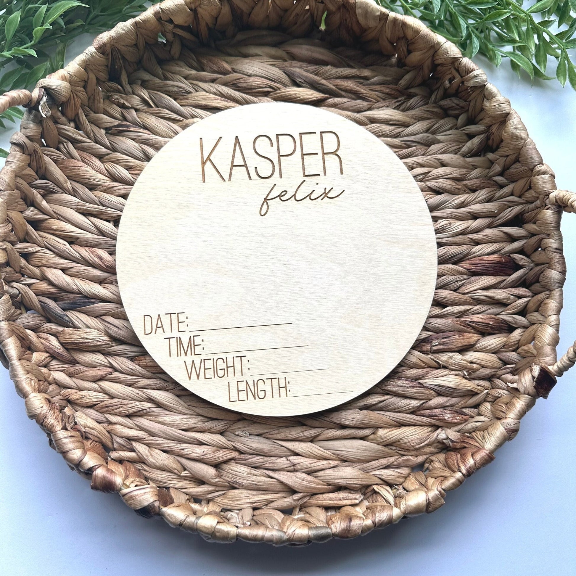 ~8” sign with name(s) engraved at the top and space to write in birth statistics at the bottom