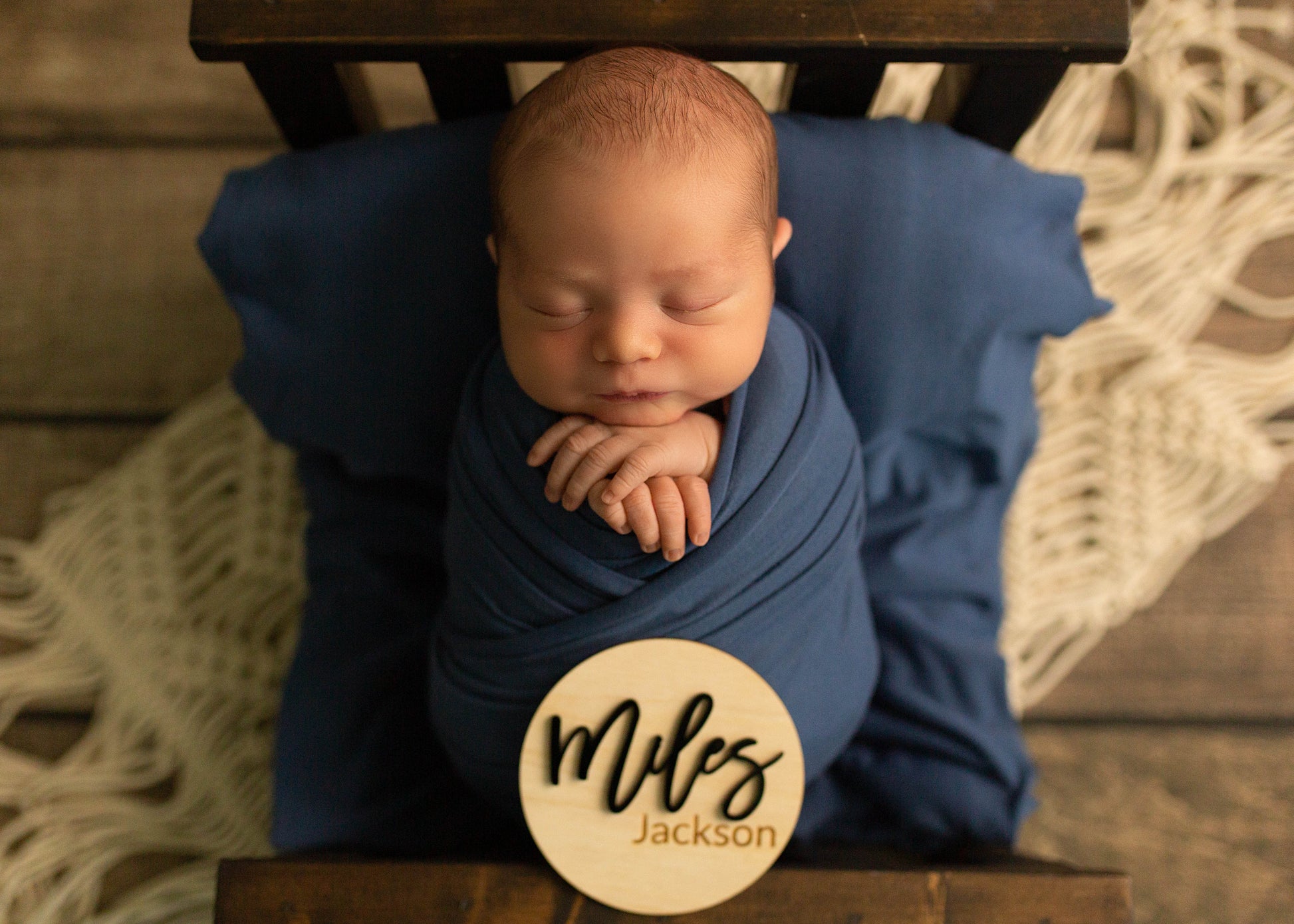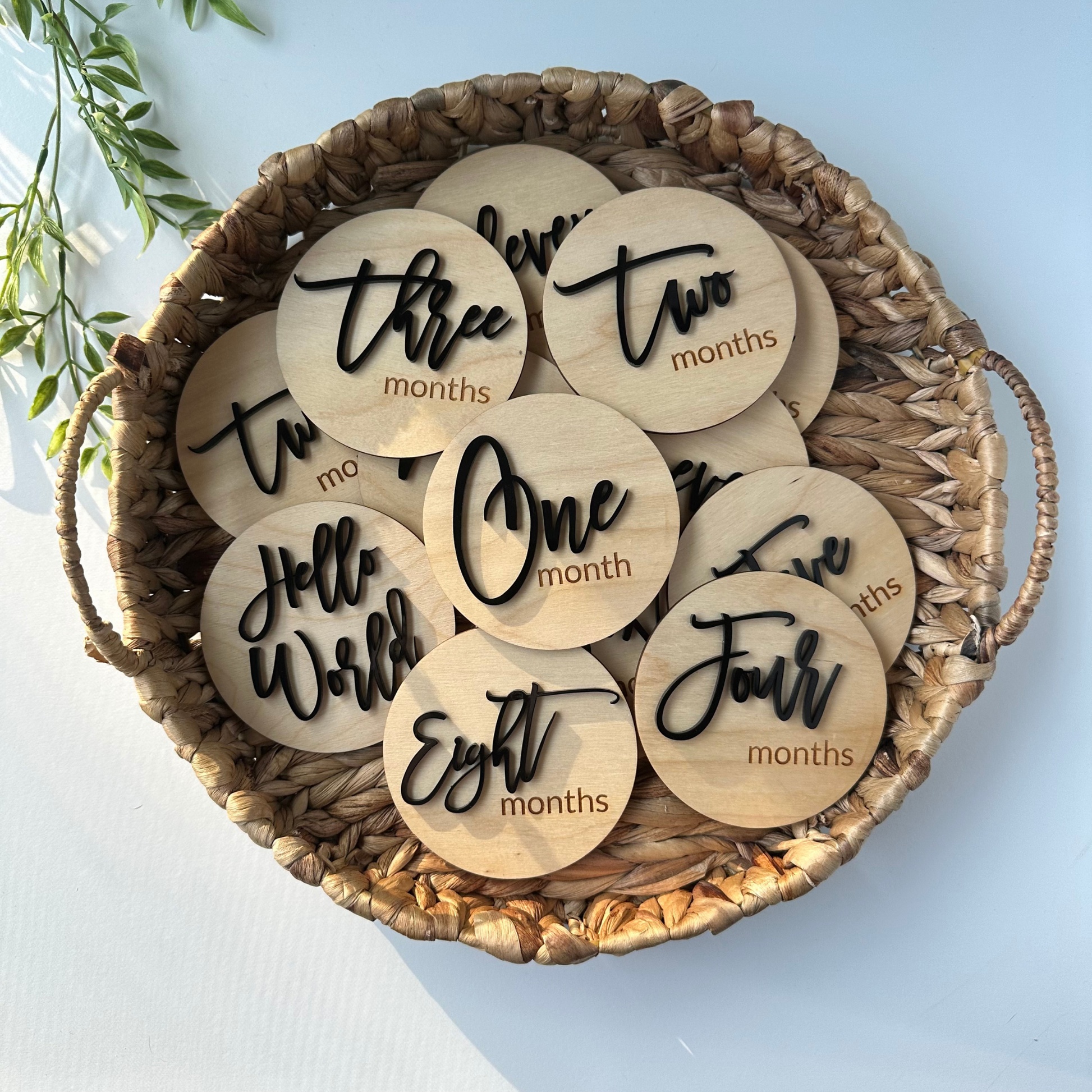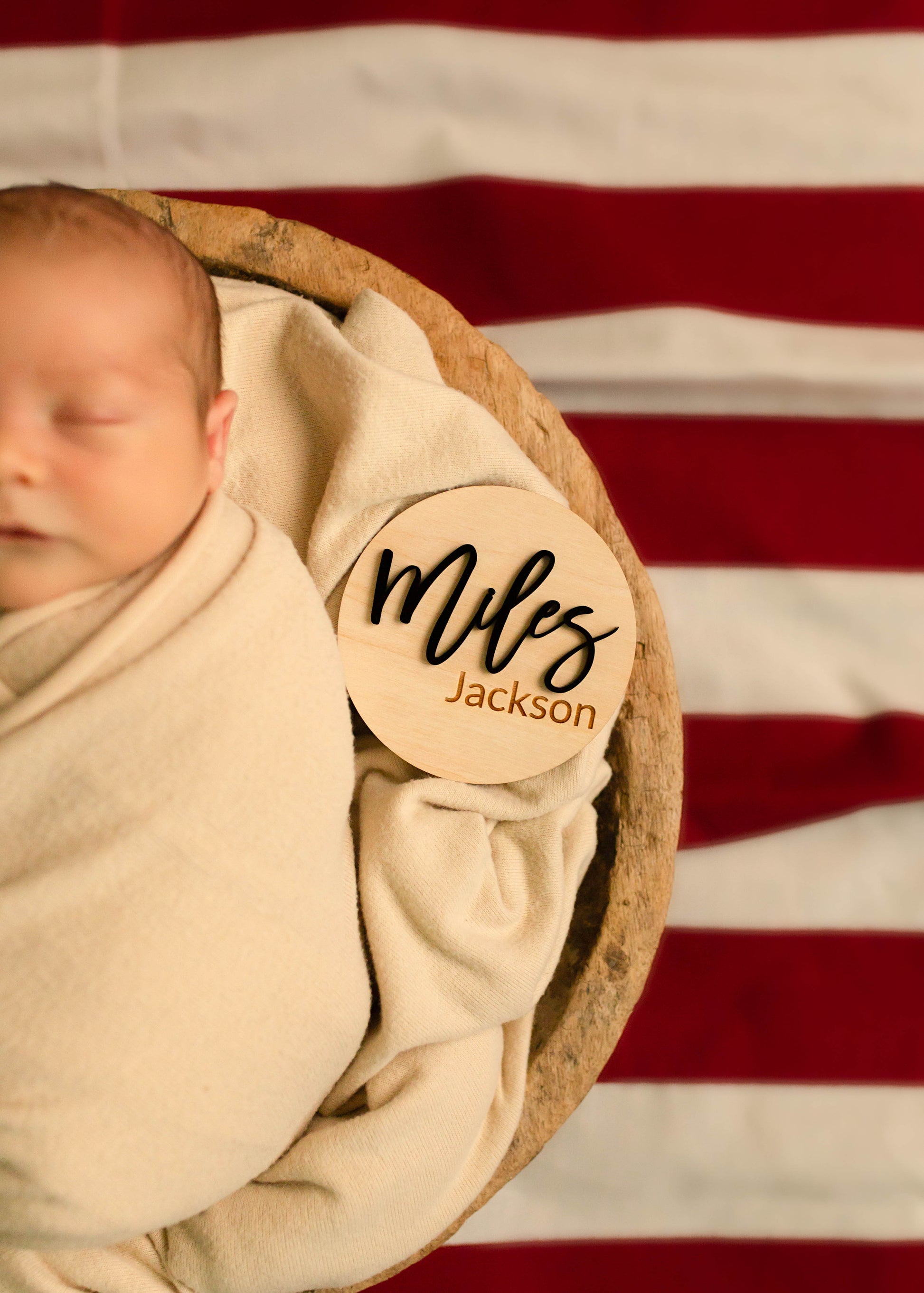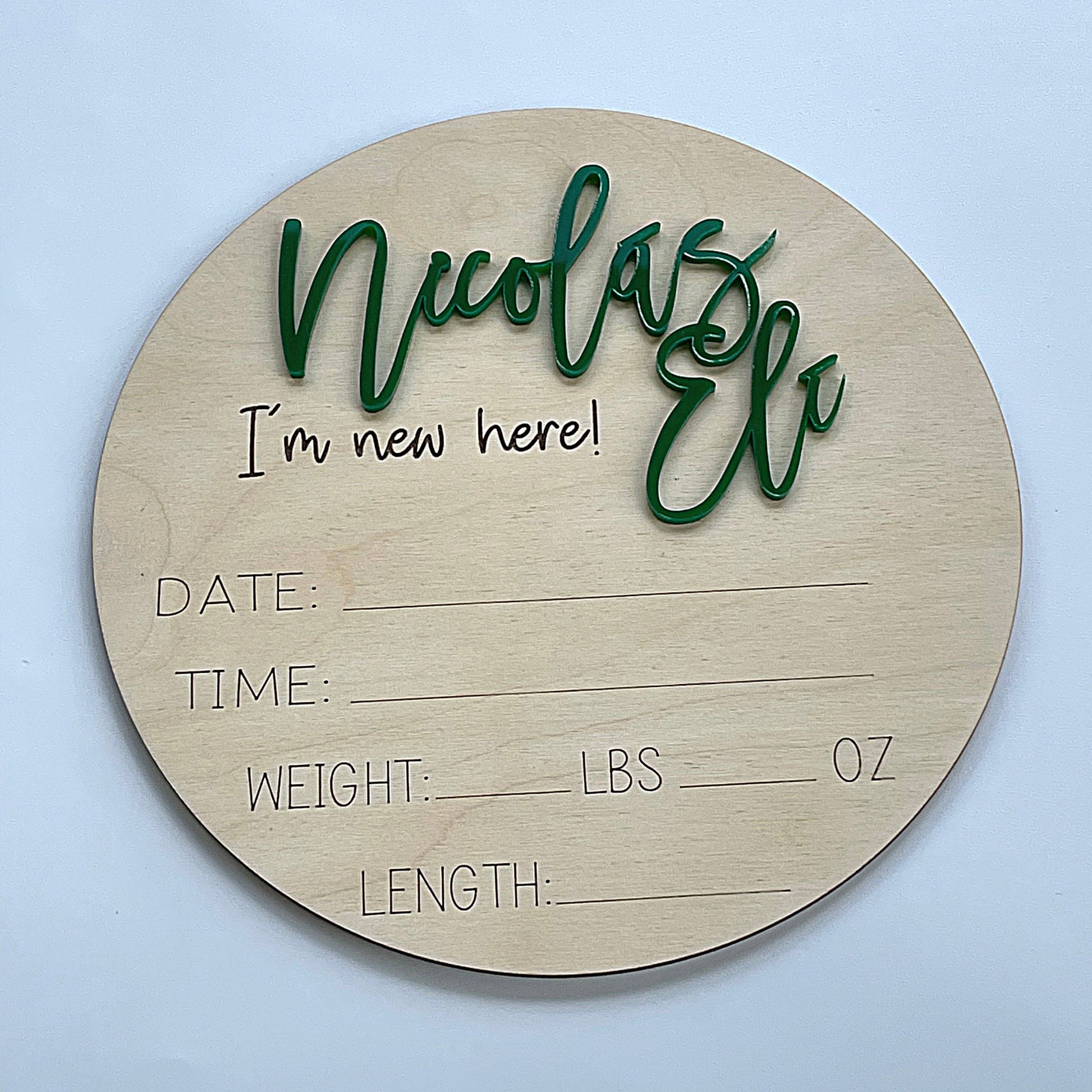 - 4” Baby Name sign, first name in an acrylic color of your choice, subsequent name(s) engraved. Fonts match the milestone set (larger sizes available in our shop)- if no color is selected black will be used