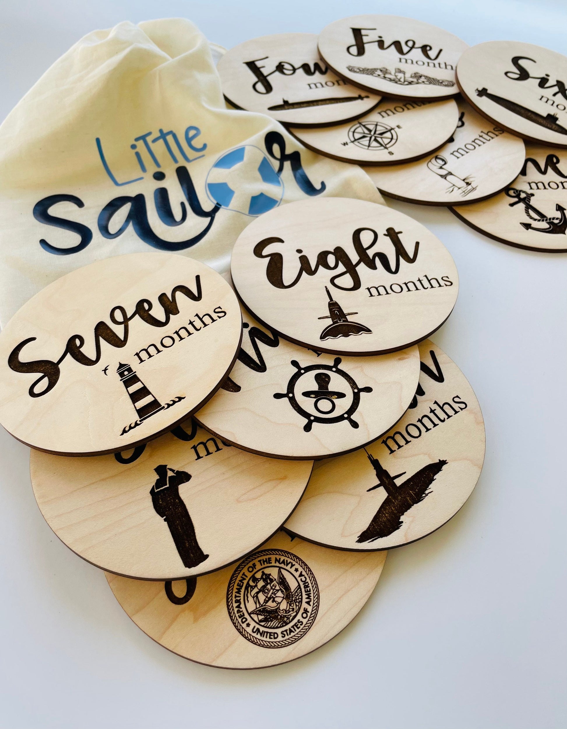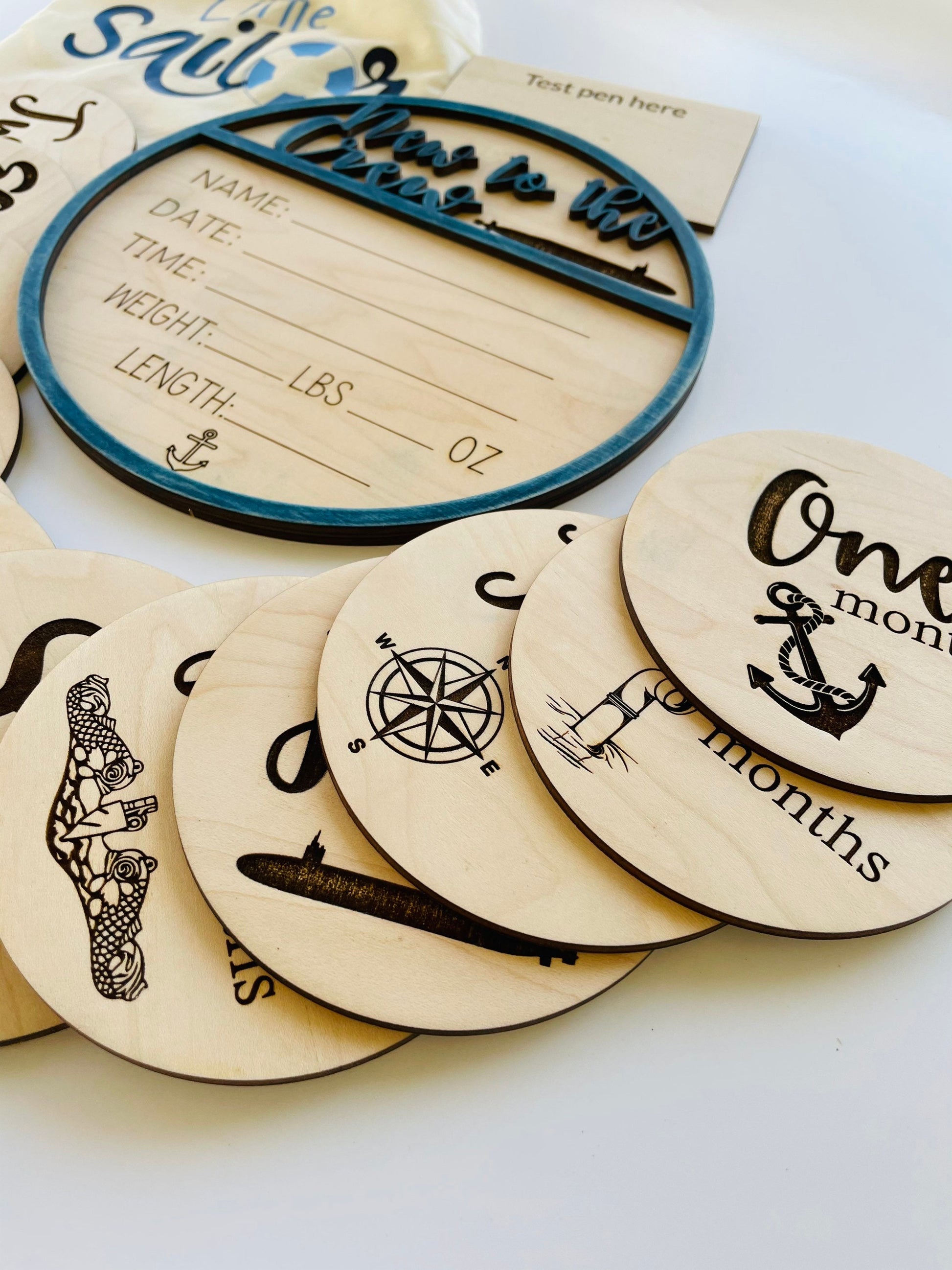 The birth announcement provides a place to write in birth stats, and each of the 12 milestone markers includes a different emblem perfect for the submarine family. Each milestone set includes a bag for storage, and each birth announcement includes a small piece of wood to test your pen before writing on it in order to create the best baby keepsake possible.