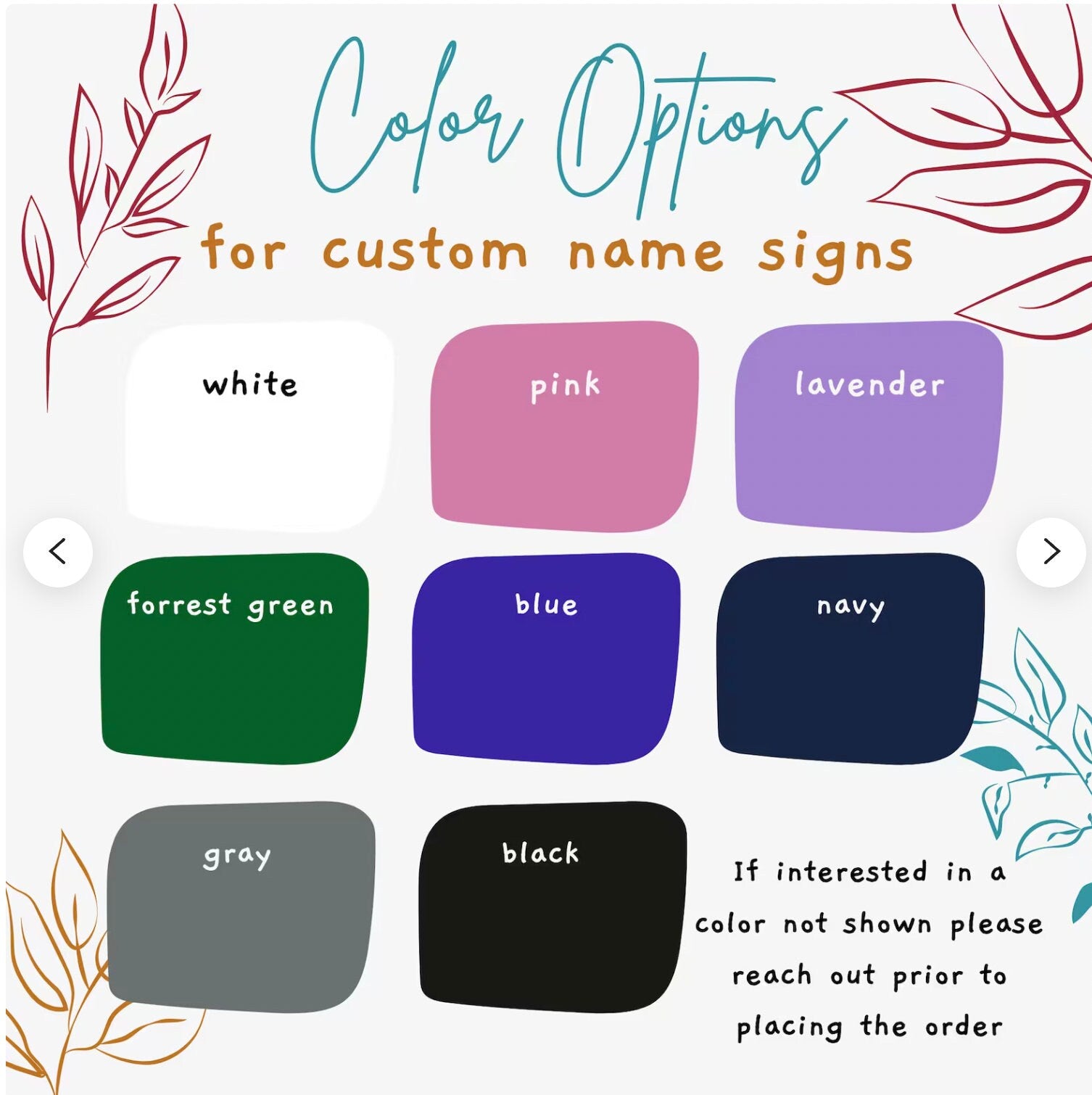 - First name in acrylic color of your choice, subsequent name(s) engraved