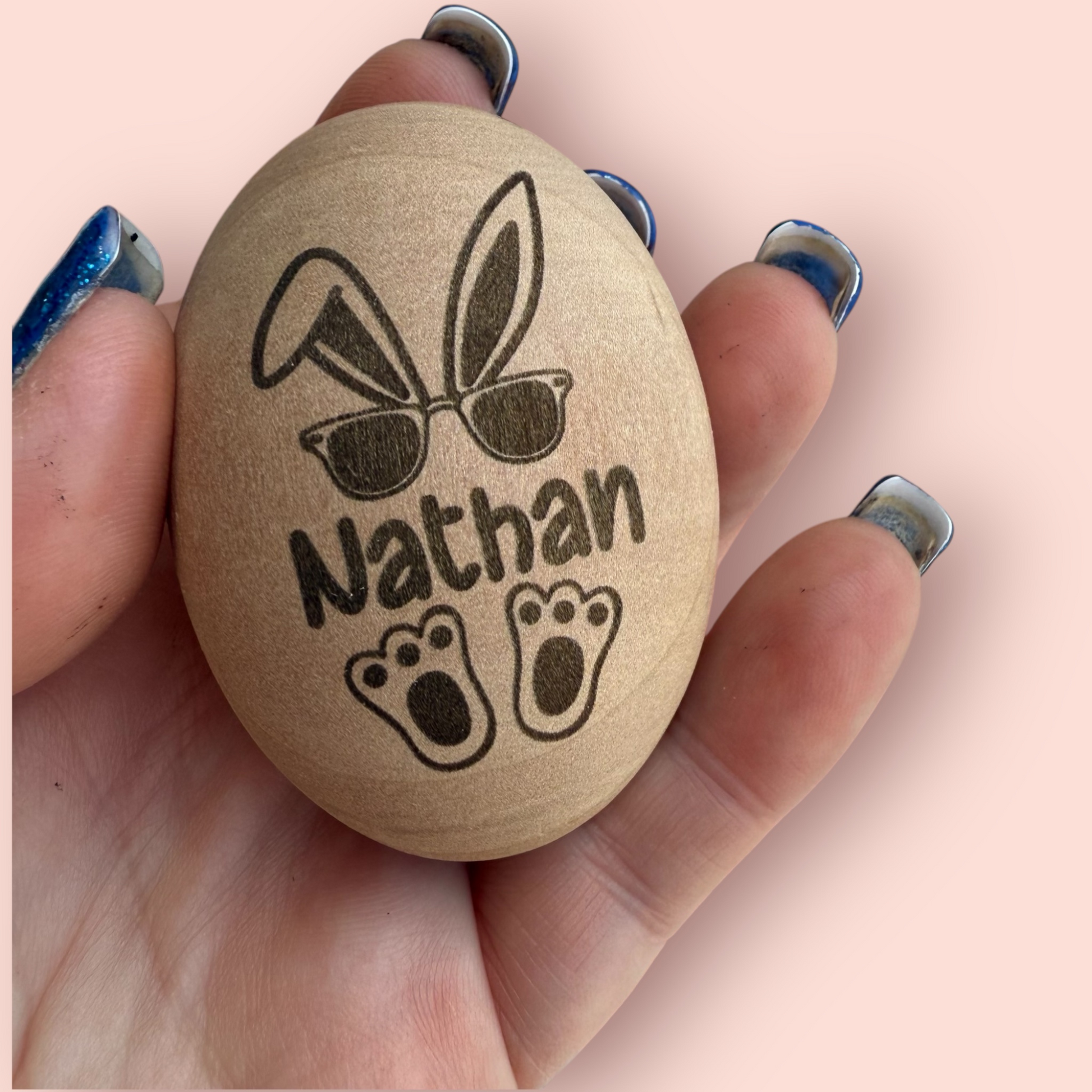 These charming wooden eggs are the perfect way to celebrate Easter, add a festive touch to your décor, or create a cherished keepsake. Crafted from solid wood, each egg is engraved with an adorable bunny design—choose from a sweet bunny with a bow or a cool bunny with sunglasses. A custom name is also engraved, making each piece truly one-of-a-kind. Whether placed in an Easter basket, displayed as décor, or given as a heartfelt gift, these eggs are a delightful addition to any celebration.