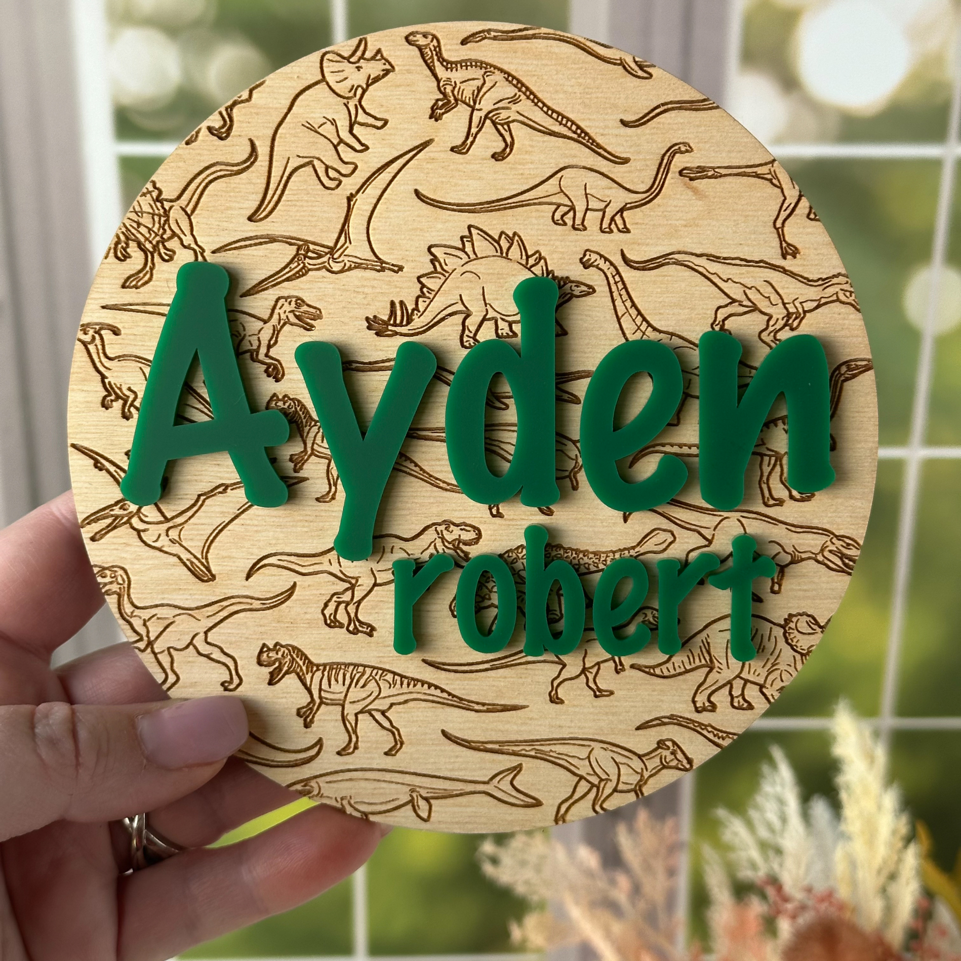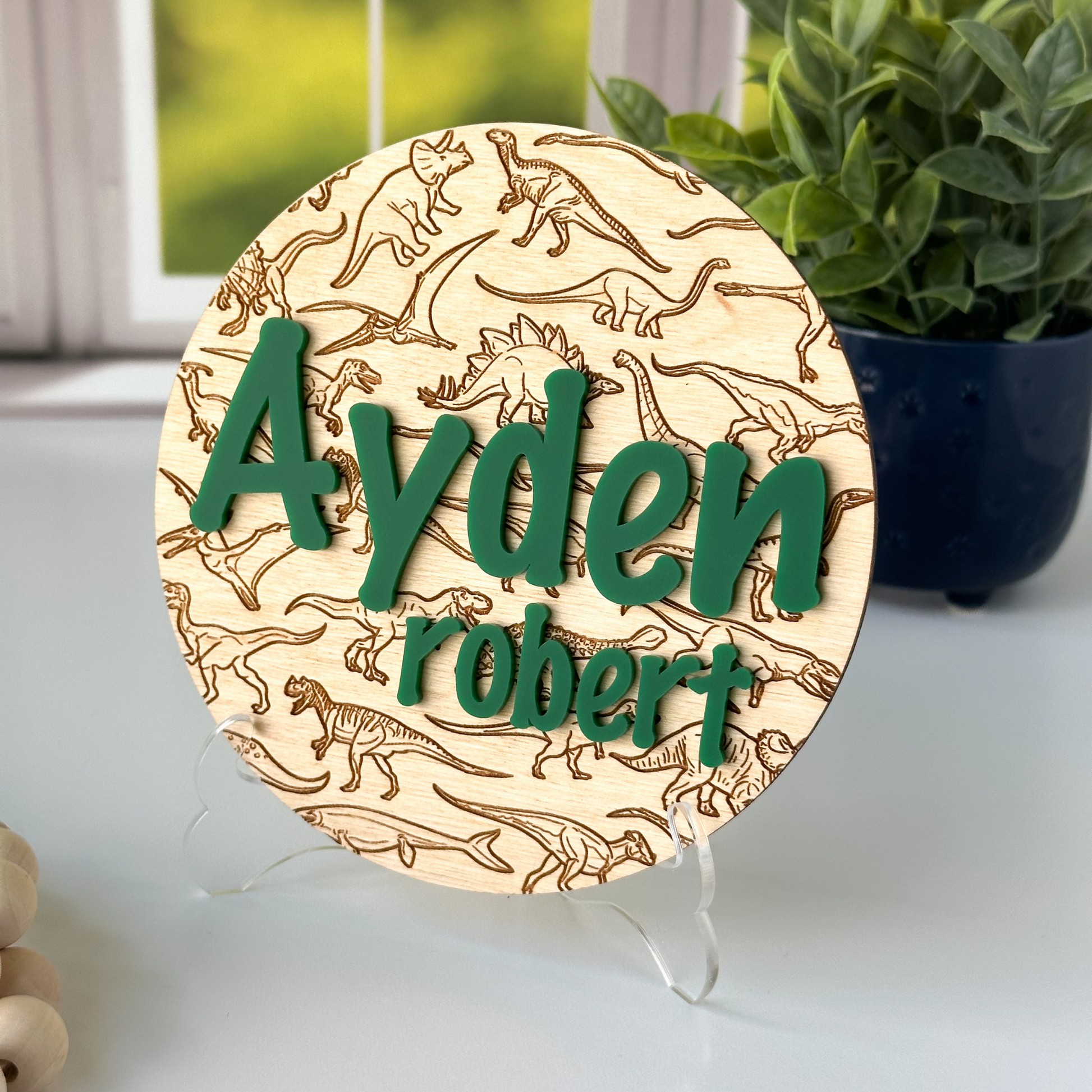 These personalized name signs are perfect for your little one or for a dino loving family!. Our round name sign is engraved with a variety of dinosaurs on the back, and the name of your choice is added in acrylic. Choose from 4 different sizes (5, 6, 8 and 10 inch diameters) and select the color of your choice for the name. This cute name sign is perfect for those special baby photos, or as a keepsake and nursery decor in the years to come. Buy now and get your personalized name sign today!