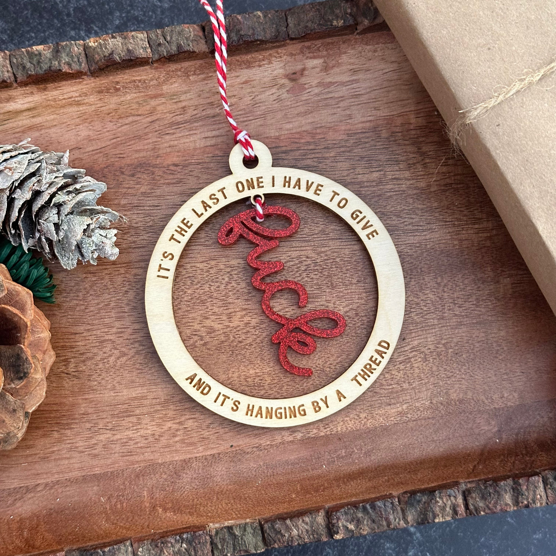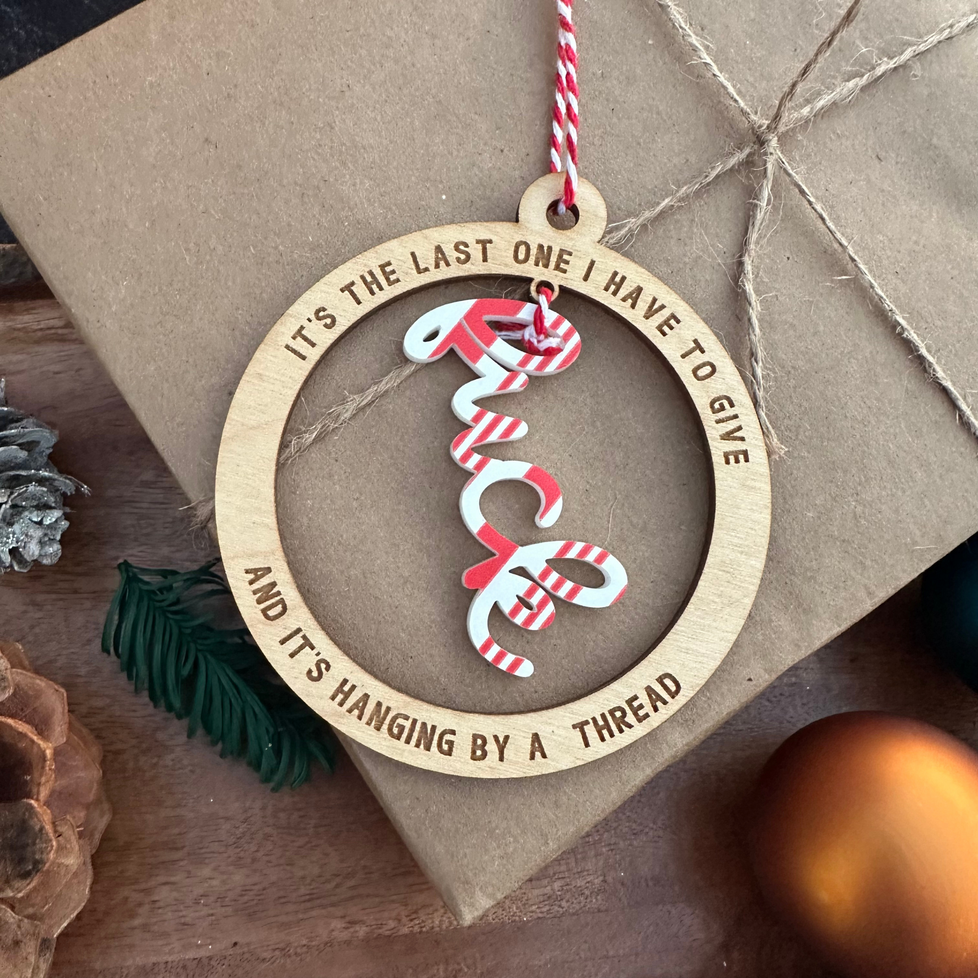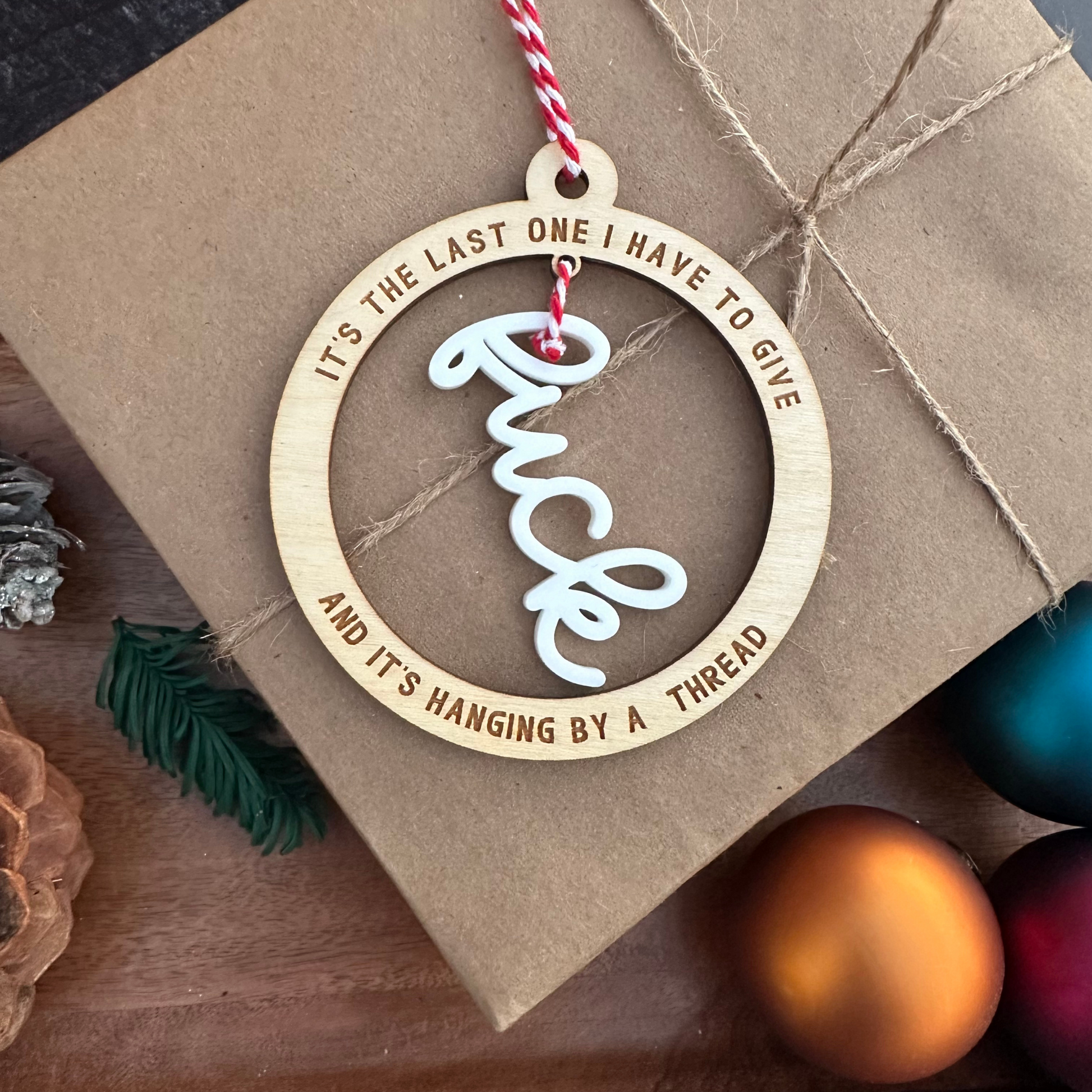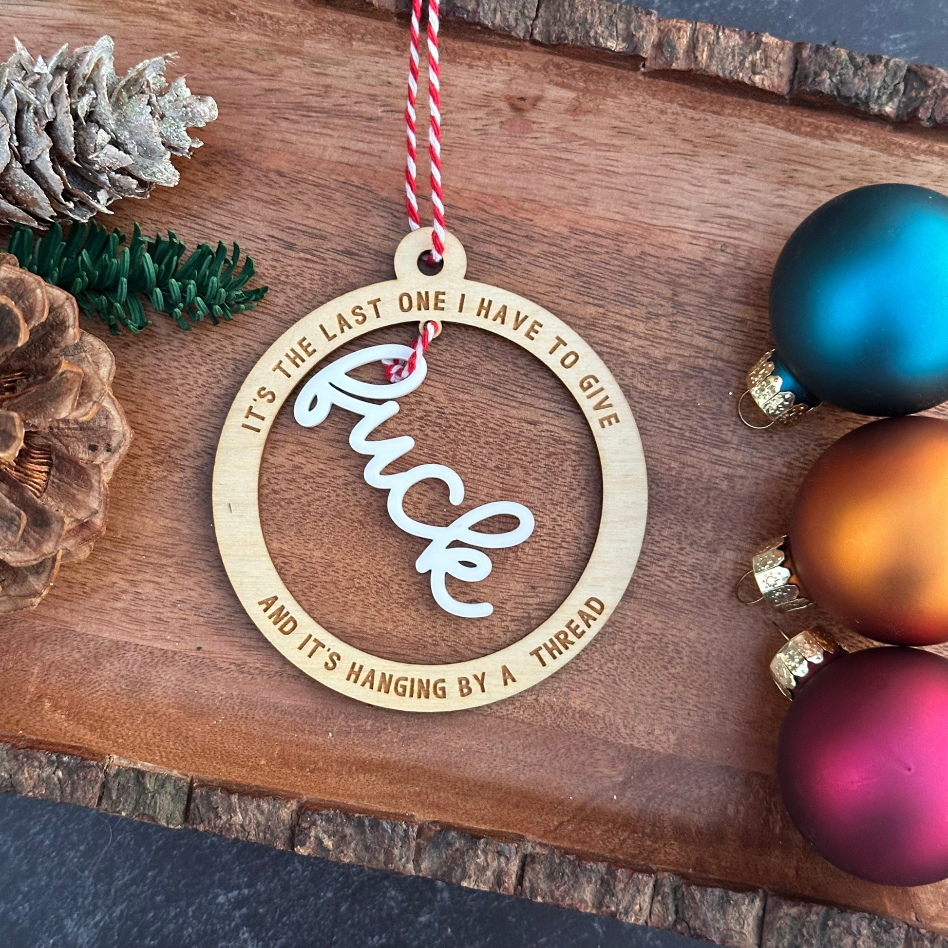 Introducing our hilarious and charming Funny Christmas Ornament! This witty ornament is a round piece of wood with a cheeky quote around the edge that's sure to bring a chuckle to anyone's face. It features the phrase “It’s the last one I have to give and it’s hanging by a thread,” with the word ‘fuck” playfully dangling from the top. Perfect for hanging on a tree or using year-round, it makes a great gift for friends, family, and coworkers who appreciate a good laugh.