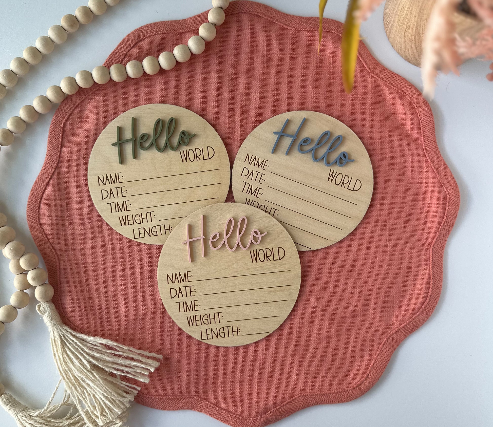 Introducing the perfect way to welcome your new arrival! This 5" birth announcement sign is a beautiful way to introduce your baby to the world. With the words "Hello World" at the top, you can choose an acrylic color to match your coming home outfit or newborn photo shoot. This sign also includes space to write in baby's name and birth stats such as date of birth, weight and length, creating a unique keepsake will be cherished for years to come.