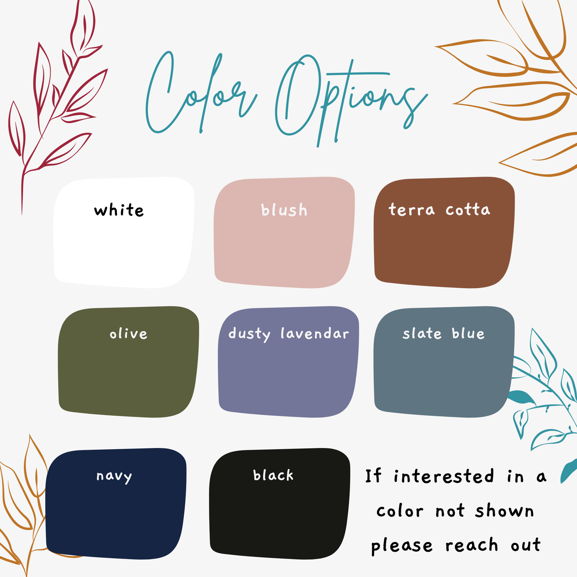 **Colors shown in photos are olive, blush and slate blue