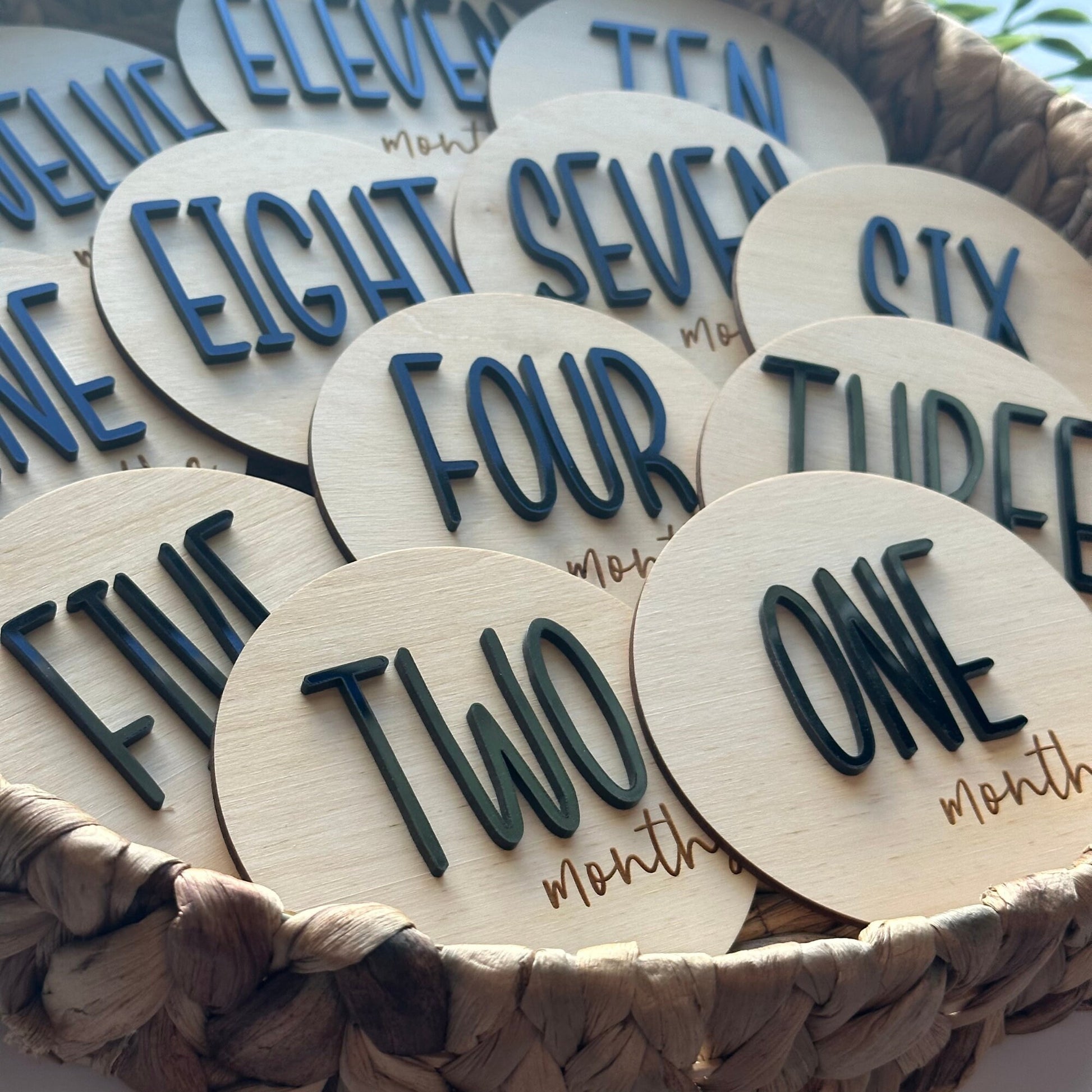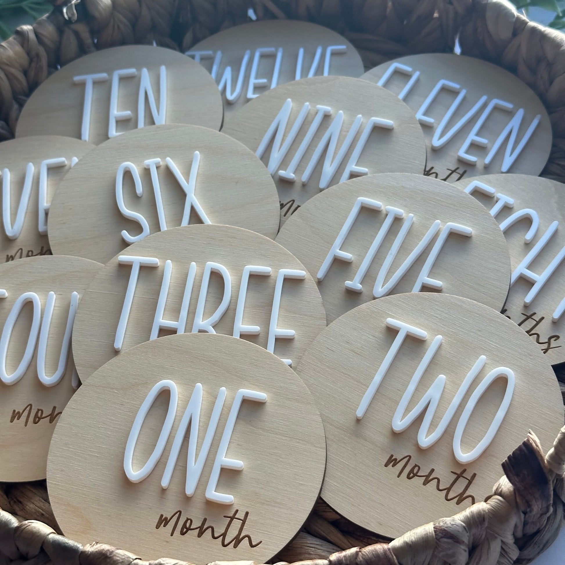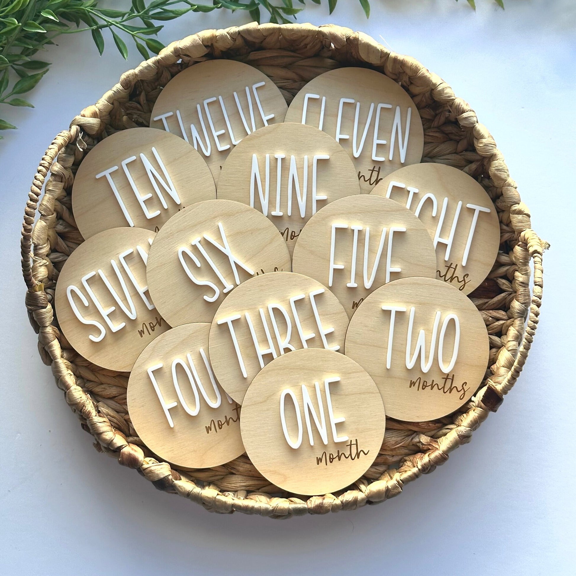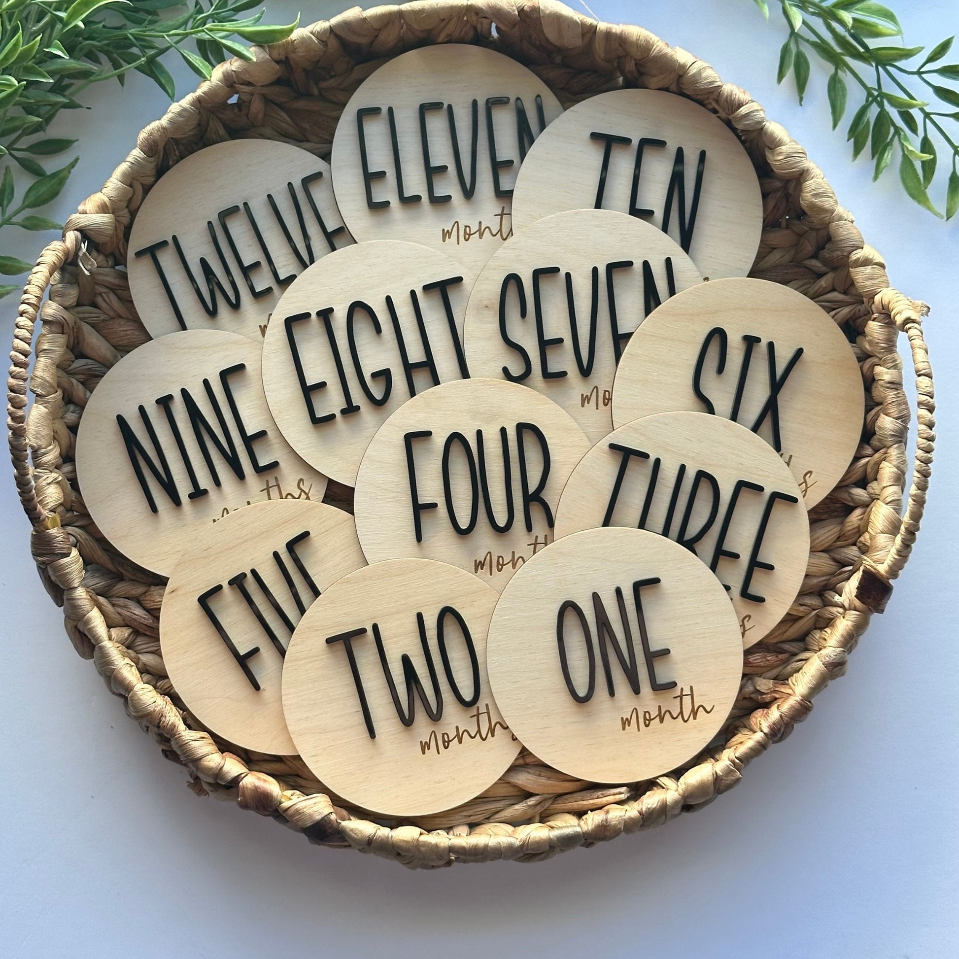 Preserve the memories of your infant's first year with these delightful monthly milestone cards! Every card is crafted with acrylic wording in the color of your preference, providing a delightful way to keep track of your baby's progress.