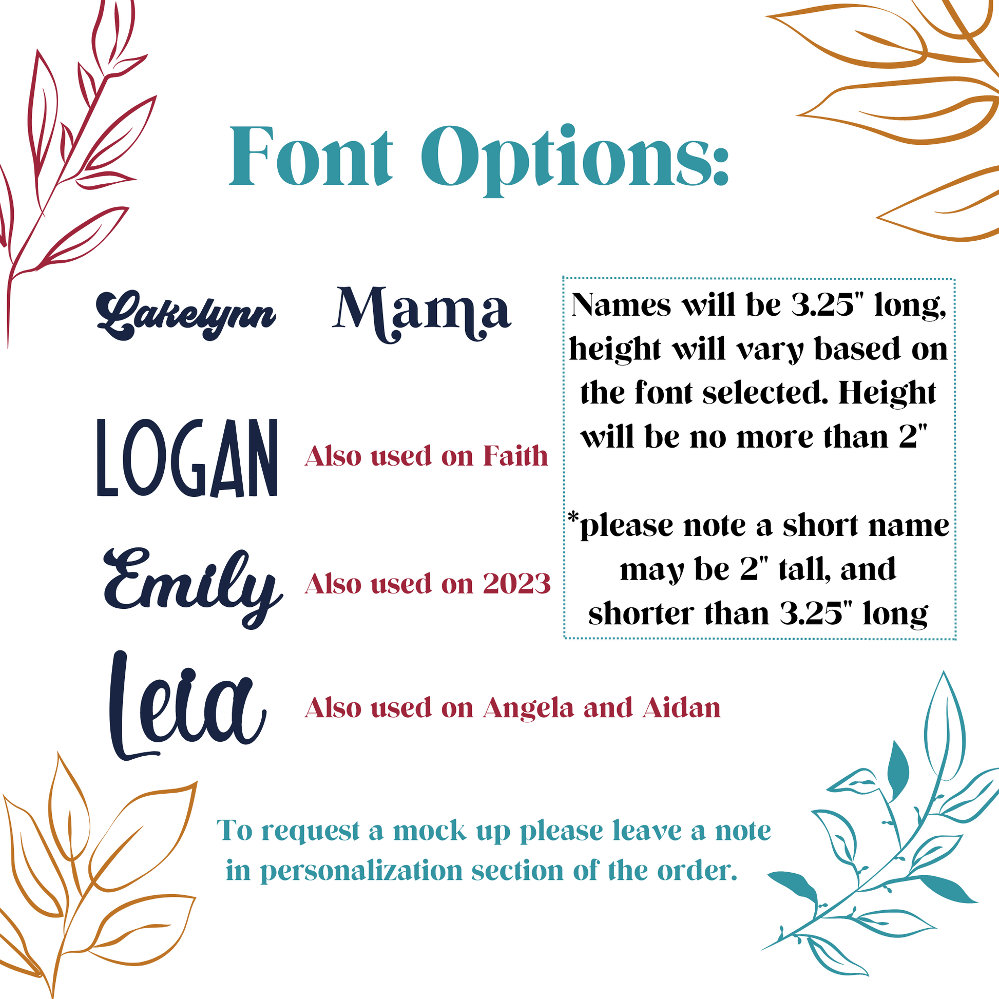 - Length will be Approx. 3.25 inches, height will vary based on the length of the name and font selected. Height will not be larger than 2"