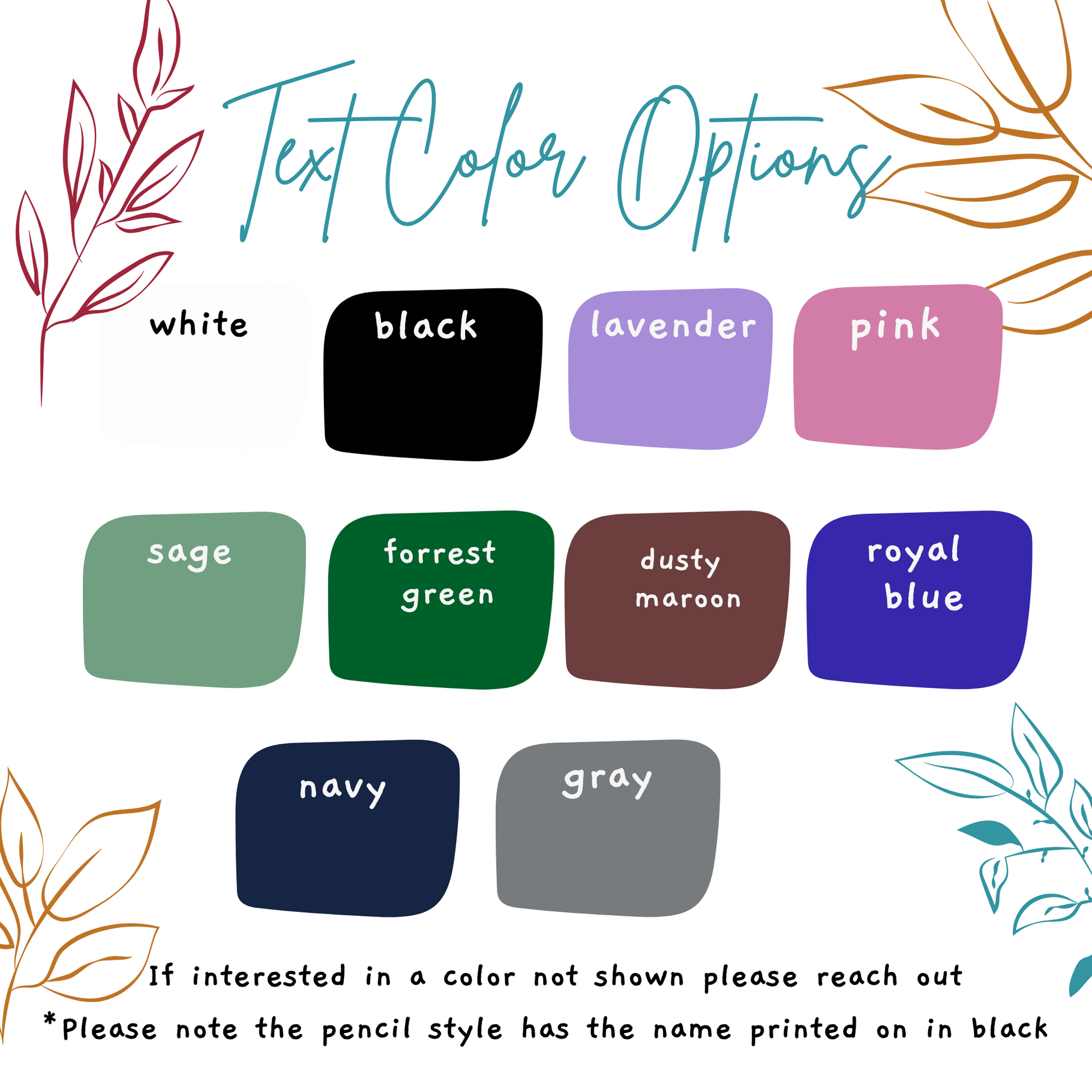 • Custom acrylic name – choose your color and font (*pencil style is printed on in black)