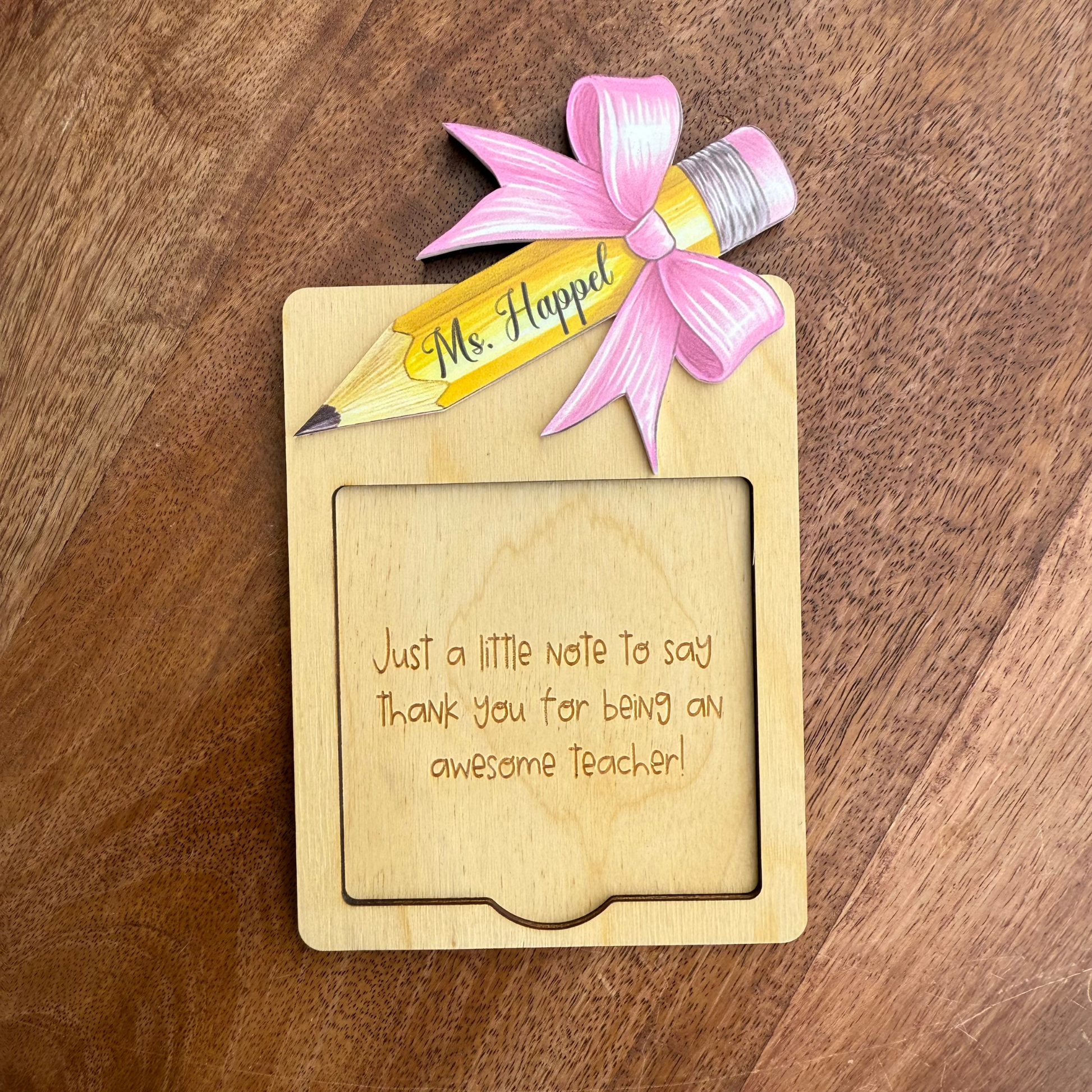 Say thank you in a thoughtful and practical way! These wooden sticky note holders make a sweet, functional gift for teachers—and a fun desk accent they’ll use every day. Each holder is personalized with your teacher’s name in acrylic and topped with a cute design like a bee, flower, pencil, or bow. Add an optional engraved message to make it extra special!