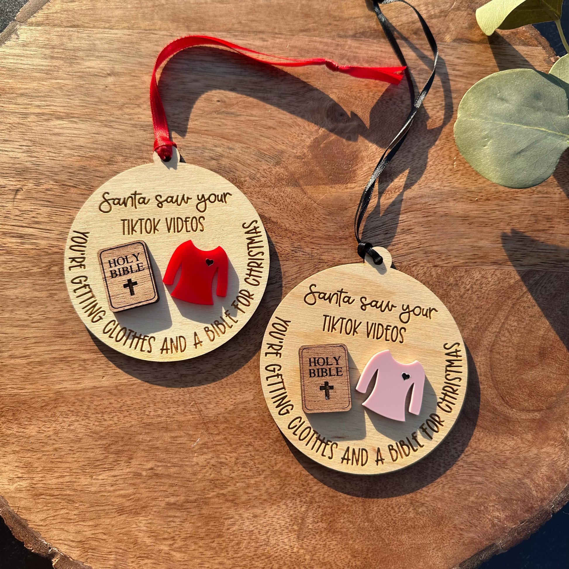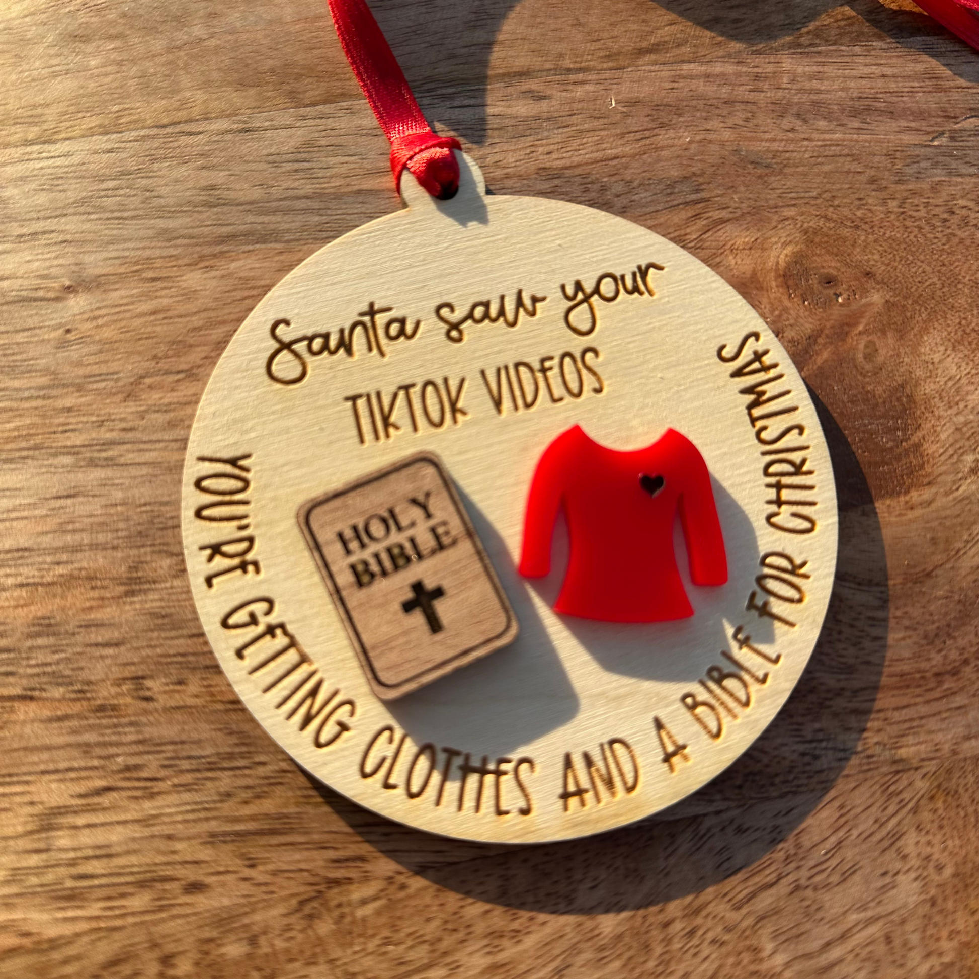 Looks like Santa’s been scrolling through your TikTok videos, and well… let’s just say, you’re getting clothes and the Bible for Christmas! This cheeky ornament is perfect for anyone who’s pushed the limits with their online antics and could use a little festive reminder to stay on the nice list.