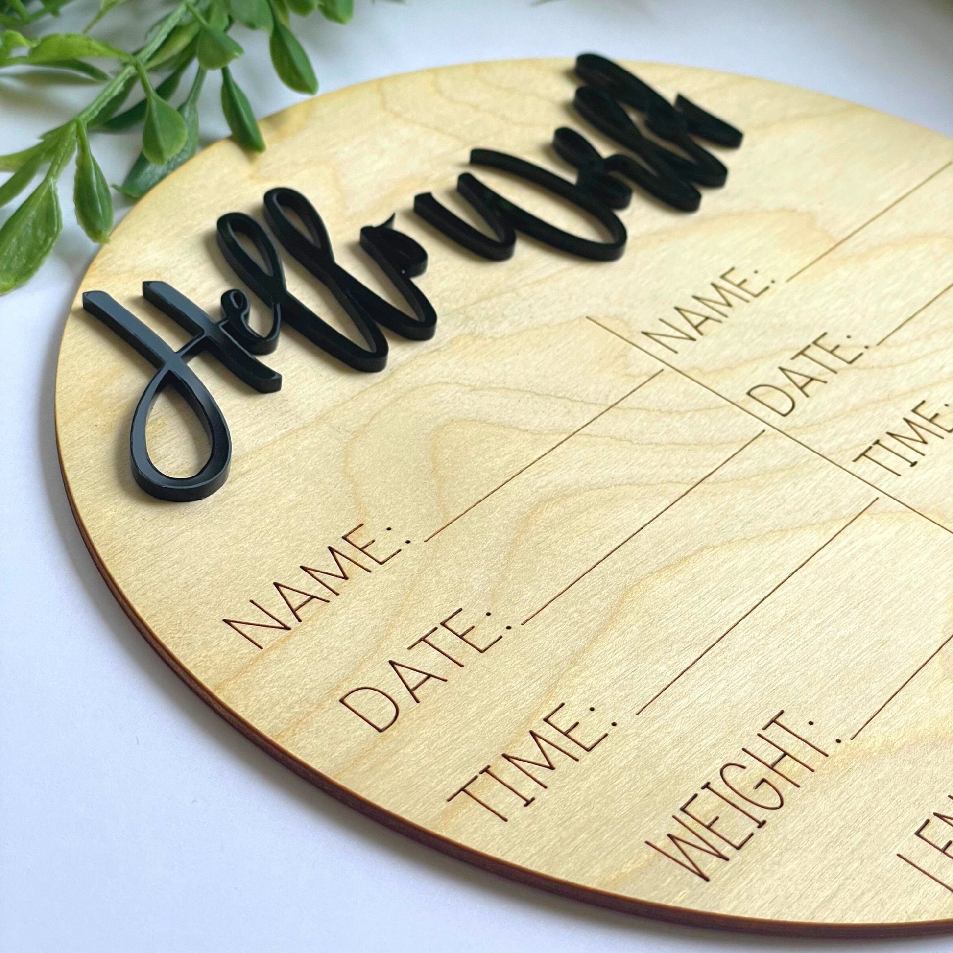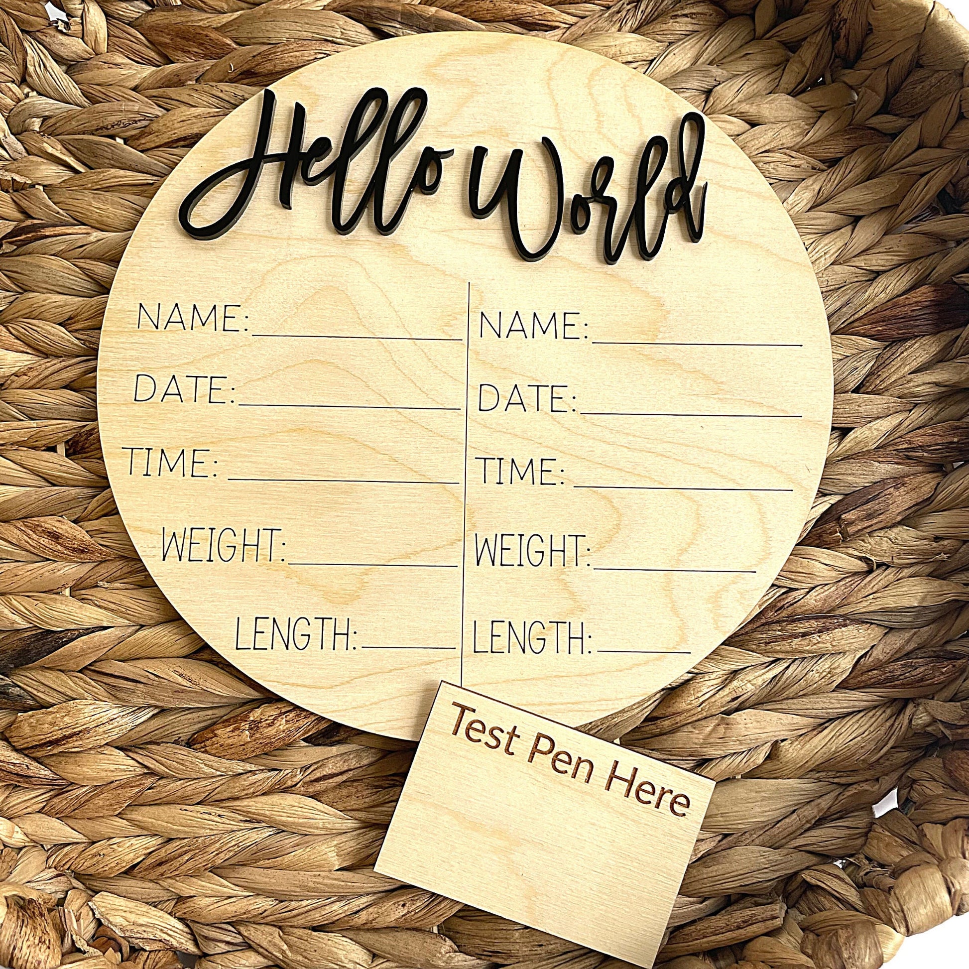 Celebrate the arrival of your precious little bundles of joy with our stunning 8 inch birth announcement sign! Featuring a standard sign that says "hello world" in acrylic at the top, or a custom sign with wording of your choice such as "Smith Twins", this sign is designed to perfectly complement your style and taste. With space to write in the birth stats for both babies, this sign is a beautiful and practical keepsake that you will treasure for years to come.Included with the sign is a square piece of wood to test your pen prior to writing.